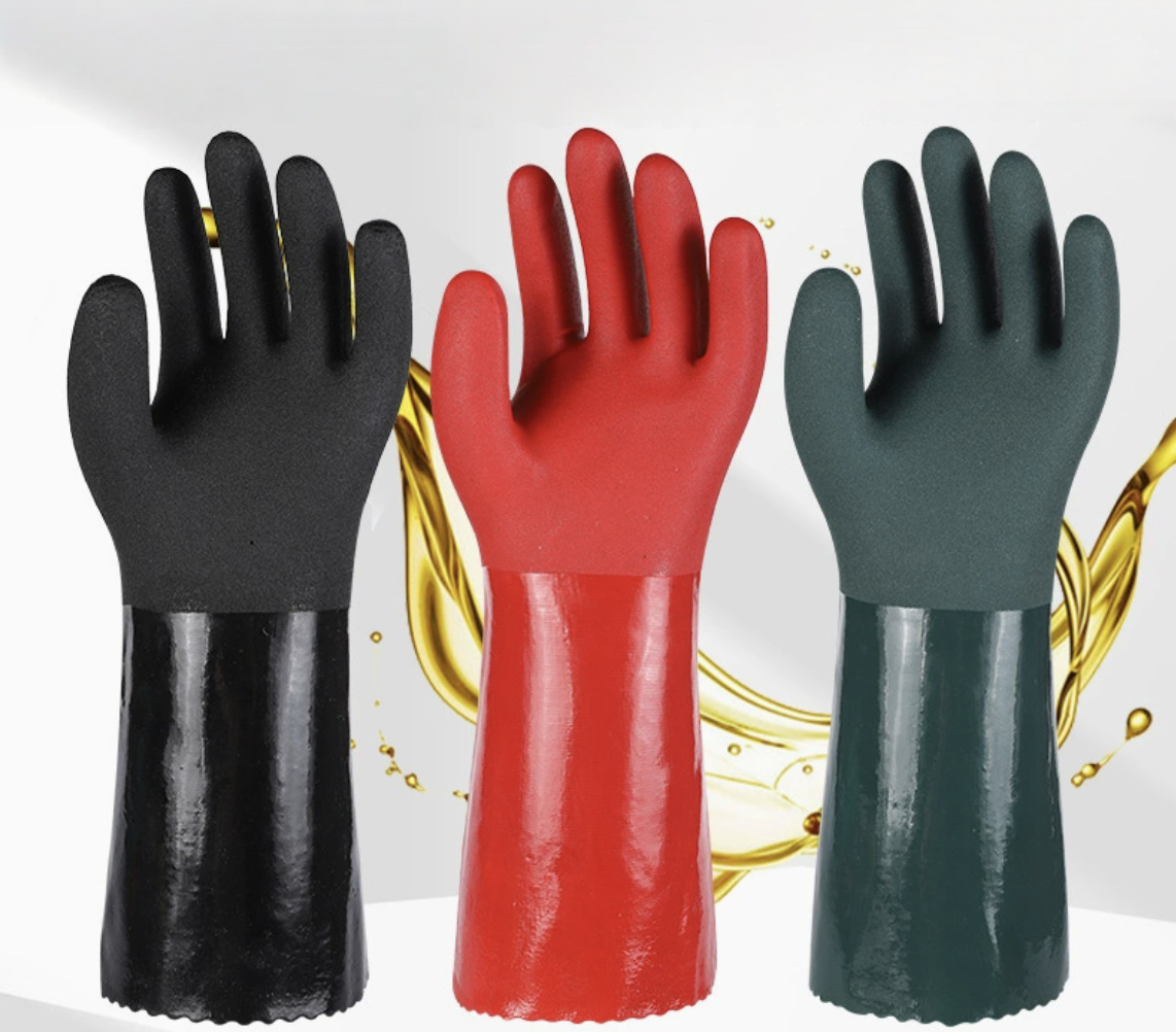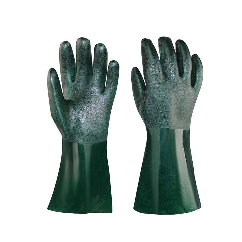 The dark green gloves feature a double-layer PVC-dipped flannel lining, ensuring comfort and reliability in demanding work environments. Their textured surface provides a non-slip grip, making them ideal for handling oily substances and chemicals.