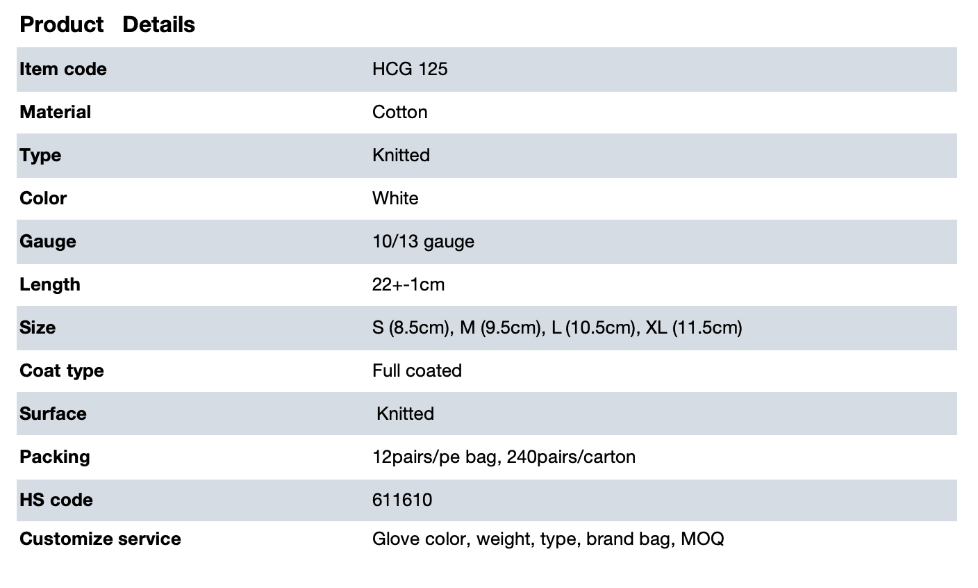 Pure cotton woven work gloves /Breathable combed cotton main body (natural white/bleached white/custom dyed colors) + elastic knitted wrist closure + reinforced palm & finger stitching /High-density pure cotton fabric, soft against skin with long-wearing comfort /Excellent sweat absorption & air permeability, suitable for long hours of daily work /Lightweight flexible construction, fits hand contour, no restraint when gripping small parts & operating tools /Reinforced stress points at palm, fingertips and thumb crotch, enhances tear & abrasion resistance, extends service life /Universal ergonomic fit for both left and right hands, ambidextrous design for easy use /Washable & reusable, low maintenance cost, economical for bulk daily use /EU Compliance: CE certified, EN388 tested for mechanical protection (basic cut, abrasion, tear resistance)