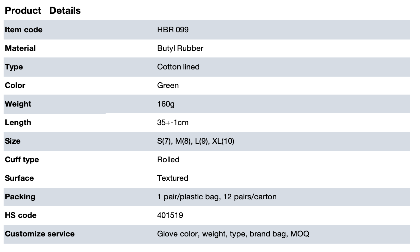 Excellent resistance to chemicals, ozone, UV Butyl Primary industries for acid/alkali resistant chemical gloves: Oil, gas, and chemical industries; electronics industry