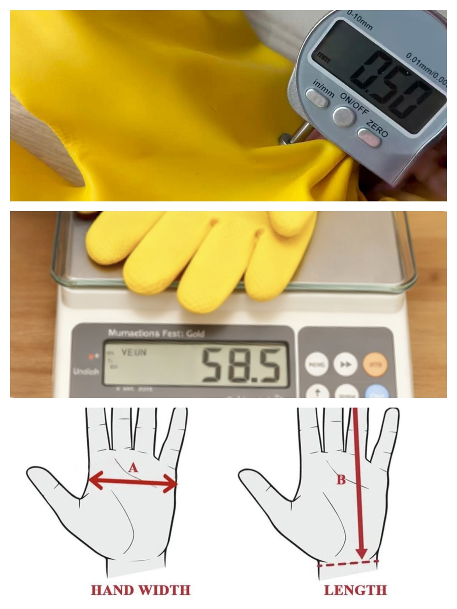 Thicker gloves offer greater durability. A thickness gauge provides precise measurements, typically taken on the single-layer thickness of the palm.